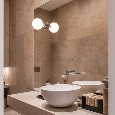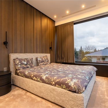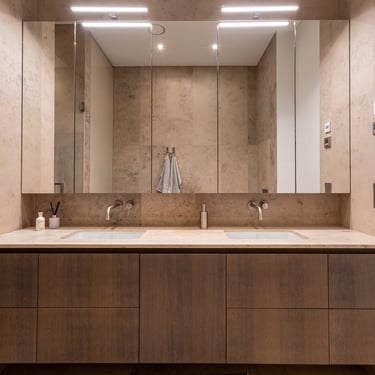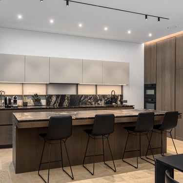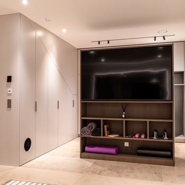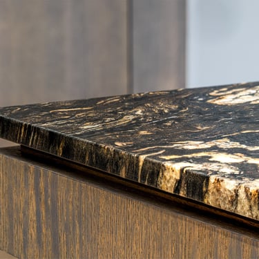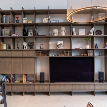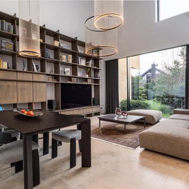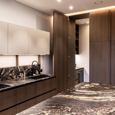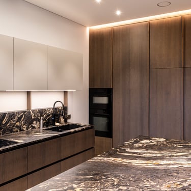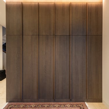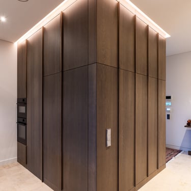 Virtuvės ir vonios baldų, virtuvės salos, tambūro drabužių spintų fasadai, TV lentyna, miegamojo apdailiniai sienų skydai: natūralus ąžuolo lukštas, beicuotas ir lakuotas