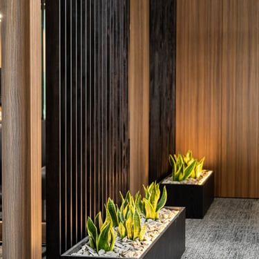Vazonai augalams: Kronospan LMDP K534AD, sumontuotas LED kryptinis apšvietimas, vazonai pripildyti skaldytu skalūnu