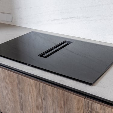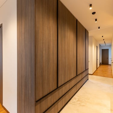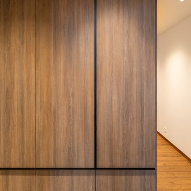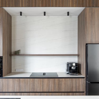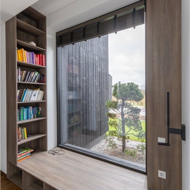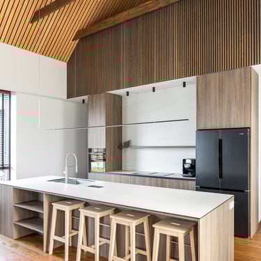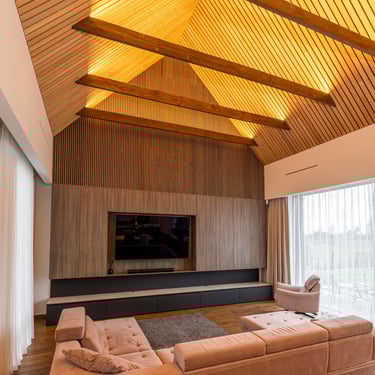 Svetainės lubų apdailiniai skydai: juodas akustinis veltinis su natūralaus ąžuolo lukšto tašeliais (beicuoti)