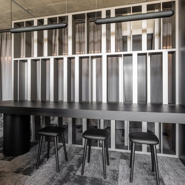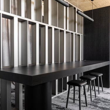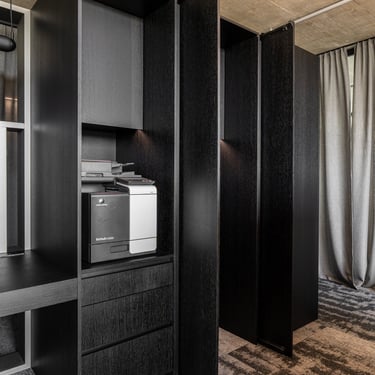 Ofiso spintų fasadai: natūralaus ąžuolo lukštas, beicuotas juoda spalva ir lakuotas matiniu laku