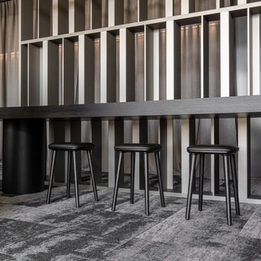 Cilindro formos stalo bazė: lankstus MDF, dengtas natūraliu ąžuolo lukštu bei beicuotas juoda spalva ir lakuotas matiniu laku