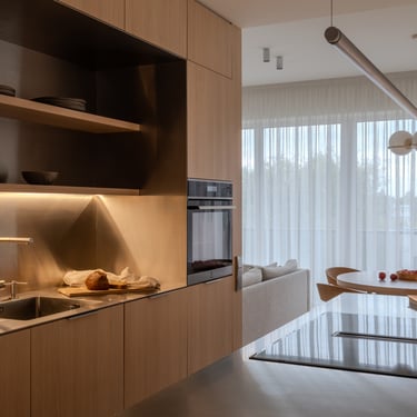 Virtuvinių baldų ir salos fasadai, TV spintelė ir lentyna, spintelė ir lentynos po laiptų pakopomis, drabužių spinta, palangės ir laiptų turėklų apdaila: Egger LMDP H3152/ST19